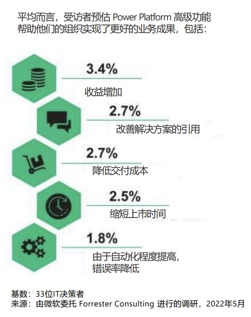 受访者指出,使用 Power Platform 高级功能之后,团队可以访问适当的企业数据、解决方案管理以及丰富的卓越中心工具包和全球企业部署所需的托管环境的许可,从而充分利用 Power Platform 的低代码功能来精简其业务流程,加强协作。