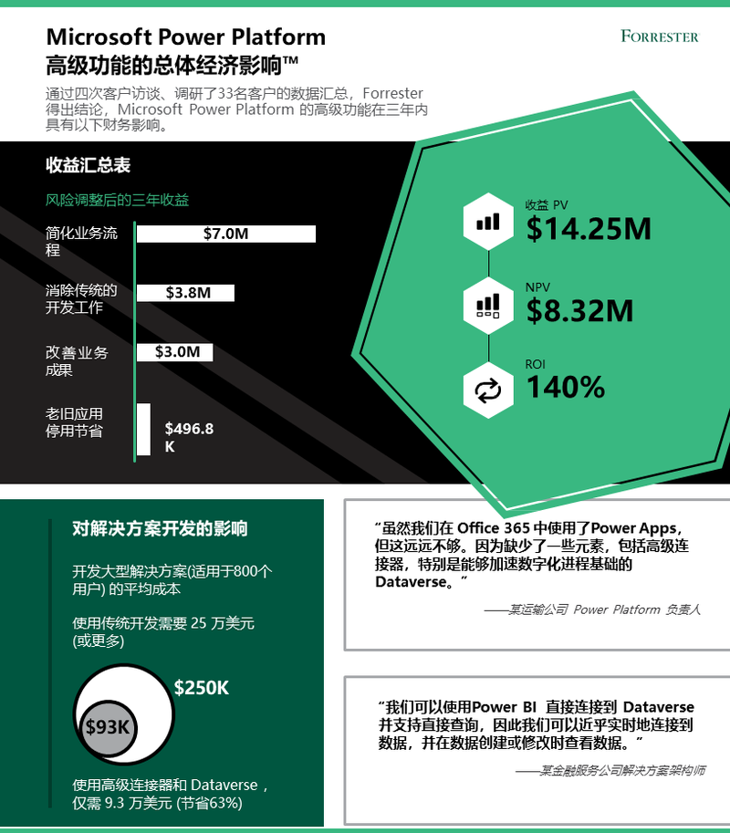 不久前,微软委托 Forrester Consulting 进行了一项名为《Microsoft Power Platform 高级功能对企业总体经济影响™》的分析研究,在对四名企业代表进行采访,并对33名有在其组织中使用 Power Platform 高级功能经验的受访者进行调研后,发现微软低代码平台 Power Platform 的高级功能可以全方位赋能企业实现降本增效,包括为企业降低45%的应用程序开发成本,以及带来高达140%的投资回报率(ROI)。