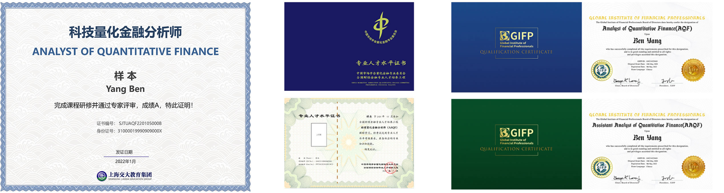 AQF认证项目由全球金融专业人士协会(Global Institute of Financial Professionals, GIFP协会)和中国市场学会量化金融专业委员会联合认证,旨在建立国内外金融领域量化金融人才培养与发展的桥梁,传递更具国际视野的研究成果与实践经验,加强全球范围内正规化、专业化的量化金融分析人才队伍建设,持续提升量化金融分析师的职业素养与能力水平,促进量化金融行业的高质量、可持续发展。